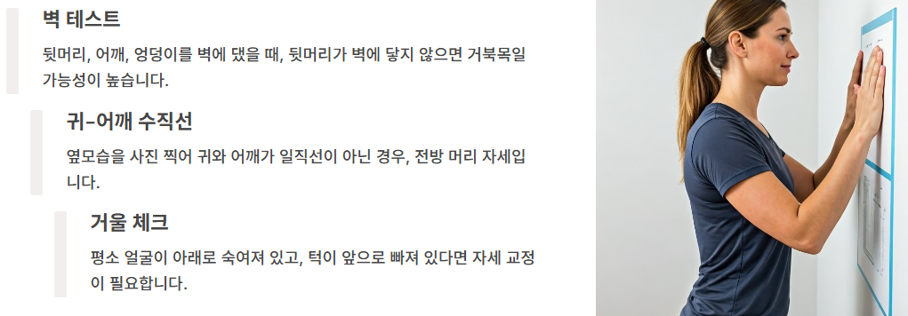 - 벽 테스트: 뒷머리, 어깨, 엉덩이를 벽에 댔을 때, 뒷머리가 벽에 닿지 않으면 거북목일 가능성이 높아요.