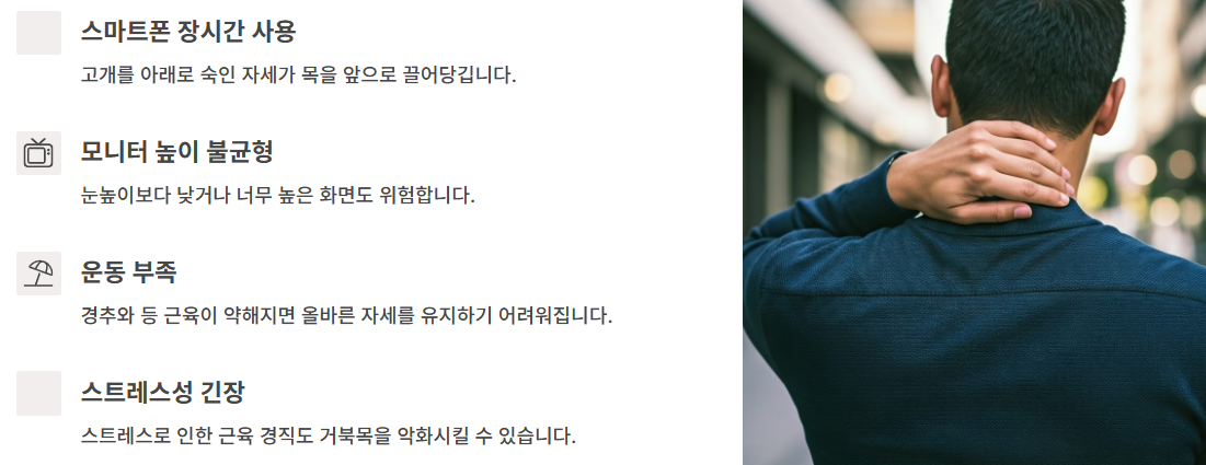 - 운동 부족: 경추와 등 근육이 약해지면 올바른 자세를 유지하기 어려워집니다.