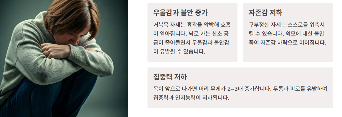 거북목은 단순히 목과 어깨의 문제에 그치지 않습니다. 여러 연구에 따르면 거북목 자세는 정신 건강에도 부정적인 영향을 줄 수 있다는 사실이 밝혀졌어요.