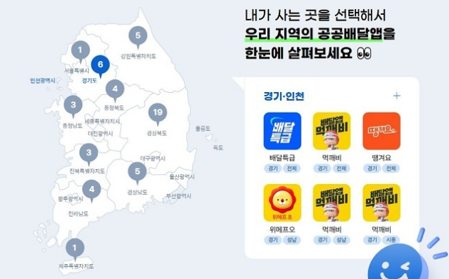 | 지자체 운영형 | 배달특급, 대구로, 배달모아, 전주맛배달, 배달의명수, 배달e음, 울산페달, 배달양산 | 경기도, 대구, 전북, 전주, 인천, 충남, 울산, 양산 등 |