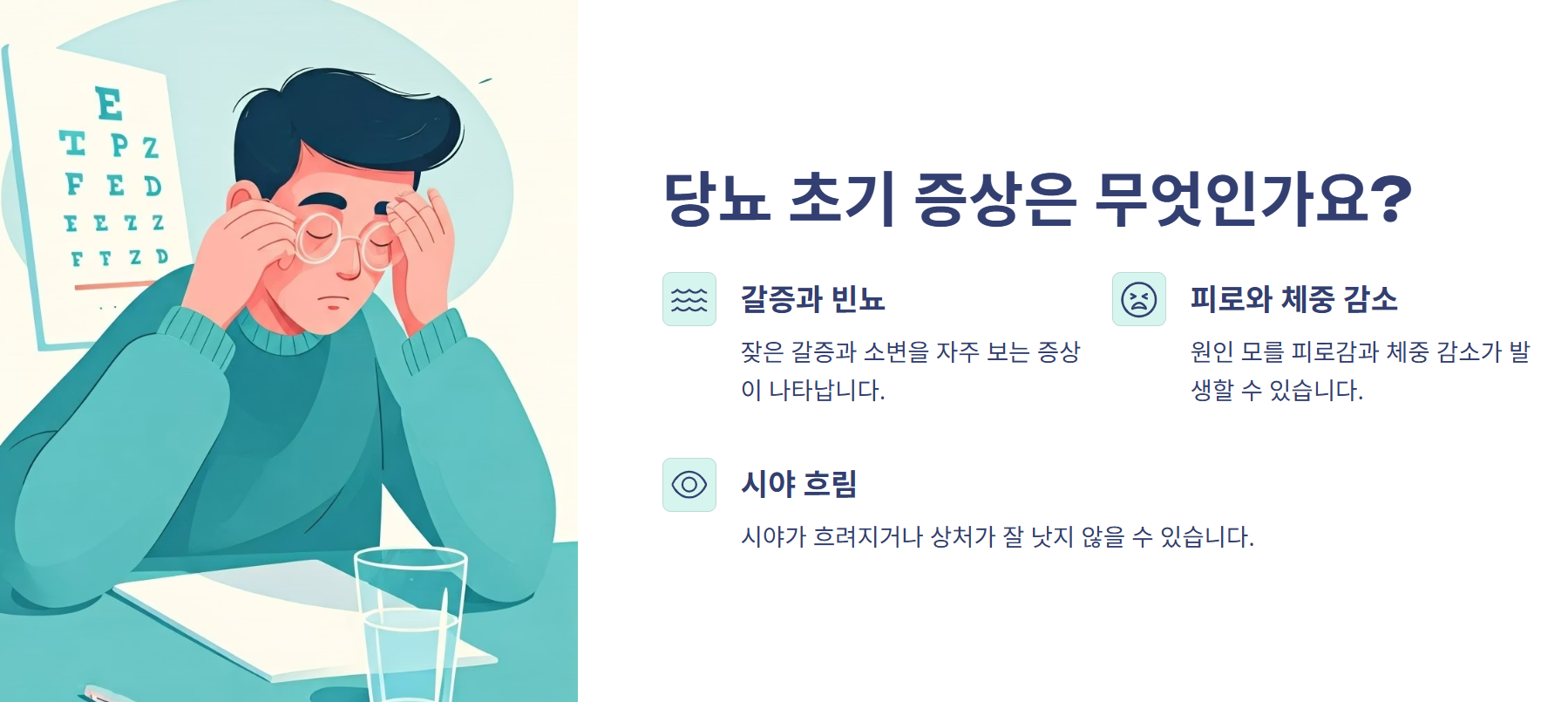 당뇨 초기에는 별다른 증상이 없지만, 몸에서 보내는 작은 신호들을 놓치지 않아야 해요. 대표적인 증상으로는 잦은 갈증, 빈뇨, 피로감, 체중 감소, 시야 흐림 등이 있습니다. 또한 상처가 잘 낫지 않거나 손발 저림 같은 말초신경 이상도 의심해볼 수 있어요. 초기 증상을 방치하면 합병증으로 이어질 수 있으니 정기적인 건강검진이 중요합니다.