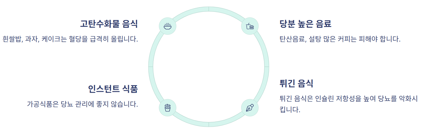 당뇨 환자에게 가장 나쁜 음식은 혈당을 급격히 올리는 고당분, 고탄수화물 음식이에요. 특히 흰쌀밥, 과자, 케이크, 탄산음료, 설탕이 많은 커피 음료는 피해야 해요. 튀긴 음식, 포화지방이 많은 육류, 인스턴트 식품도 인슐린 저항성을 높여 당뇨 악화를 유발할 수 있습니다. 섭취를 최소화하고 가공되지 않은 자연식품 위주로 바꾸는 것이 중요해요.