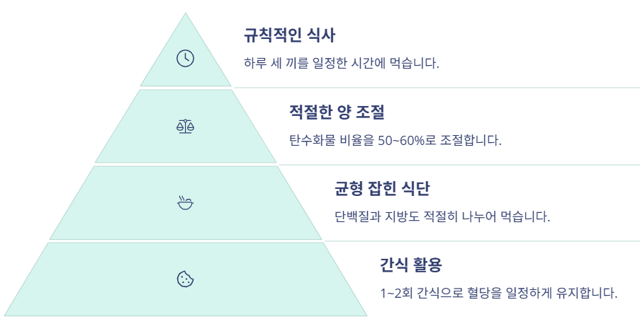 당뇨 식이요법은 "규칙적인 식사"와 "적절한 양 조절"이 핵심이에요. 하루 세 끼를 일정한 시간에 먹고, 탄수화물 비율을 50~60%로 조절하는 것이 기본입니다. GI 지수가 낮은 음식 위주로 섭취하고, 단백질과 지방도 적절히 나누어 먹는 것이 좋아요. 특히 ‘1일 3회 식사 + 1~2회 간식’을 통해 혈당을 일정하게 유지하는 것이 중요합니다.