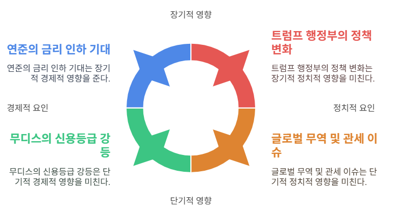 2024년 대선 이후 트럼프 대통령 당선으로, 법인세 인하(21%→15%)와 규제 완화, 국내 생산 인센티브 정책이 추진될 전망입니다. 이는 기업 이익 증가와 금융·에너지 등 전통 산업의 주가 상승에 긍정적으로 작용할 수 있습니다. 다만, 대중국 관세 인상 등 무역 갈등 리스크가 일부 업종에는 부담 요인으로 작용할 수 있습니다. 투자자들은 트럼프 행정부의 정책 변화가 시장에 미칠 중장기적 영향에 주목하고 있습니다.