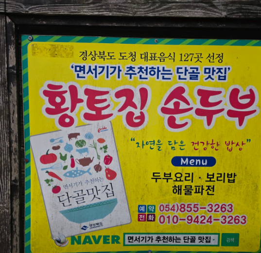 봉정사 주변 반경 10km 이내에는 현지인들에게 꾸준히 사랑받는 맛집과 감성 카페들이 자리잡고 있습니다. 대표적인 맛집으로는 '황토집 손두부'가 있으며, 봉정사 입구에서 차로 1분 거리에 위치한 이곳은 경북 안동시 서후면 태장리 931에 자리해 있습니다. 직접 밭에서 재배한 흰콩과 검정콩으로 만든 두부와 순두부가 일품이며, 손두부, 순두부 백반, 두부전골, 버섯두부전골, 배추전, 송이된장찌개 등 풍부한 메뉴를 자랑합니다. 특히 반찬 가짓수가 다양하고 정성이 가득해 지역 주민은 물론 관광객에게도 인기가 높습니다. (영업시간: 매일 11:30~15:00, 월요일 휴무)