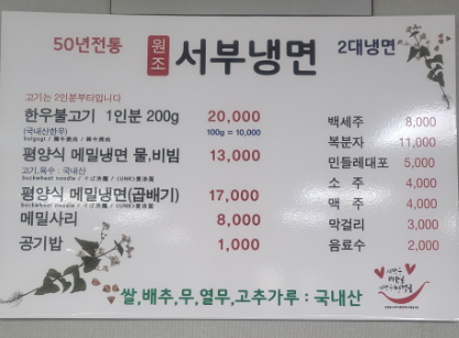 원조서부냉면은 40년 전통의 평양식 메밀냉면 전문점으로, 직접 뽑은 면과 감칠맛 나는 육수가 일품입니다. 한우불고기와 냉면을 함께 즐길 수 있어 여름철 시원하게 한 끼 하기에 제격이에요. 깔끔한 맛과 오랜 전통, 현지인 추천이 많은 점이 강점입니다. 여름철에는 대기 인원이 많을 수 있습니다.