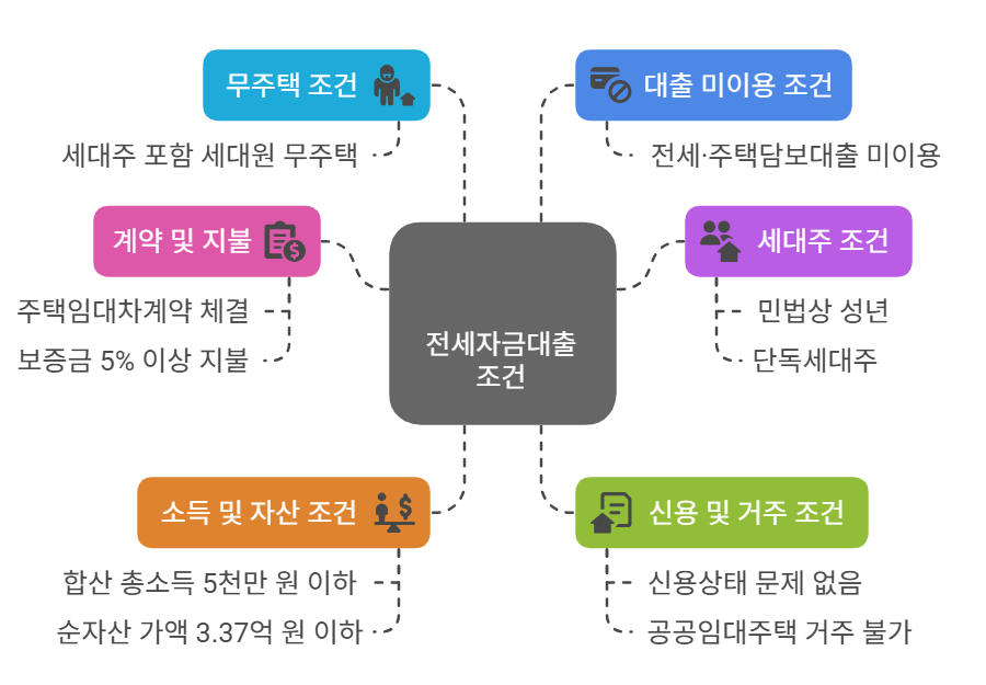 대출을 받기 위해서는 아래 조건을 모두 충족해야 해요. ① 주택임대차계약 체결 후 보증금의 5% 이상을 지불한 자 ② 대출일 현재 민법상 성년인 단독세대주(예비세대주 포함) ③ 세대주 포함 세대원 모두 무주택자 ④ 다른 전세·주택담보대출 미이용자 ⑤ 대출 신청인과 배우자의 합산 총소득이 5천만 원 이하 ⑥ 순자산 가액이 3.37억 원 이하 (2025년 기준) ⑦ 신용상태에 문제가 없어야 하며, 공공임대주택 거주 중이면 불가합니다.