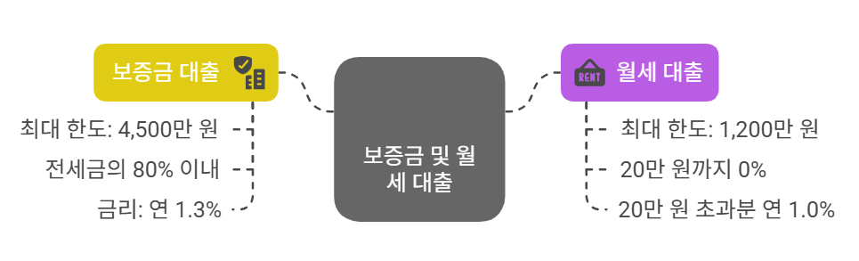 보증금 대출 한도는 최대 4,500만 원, 월세 대출은 총 1,200만 원까지 가능하며, 신규계약 시 전세금의 80% 이내, 보증금 대출금은 70% 이내로 제한돼요. 금리는 보증금 대출 연 1.3%, 월세 대출은 20만 원까지는 0%, 20만 원 초과분은 연 1.0%의 초저금리로 이용할 수 있어요. ※ 자산심사 부적격 시 가산금리 부과