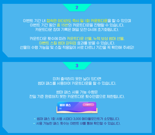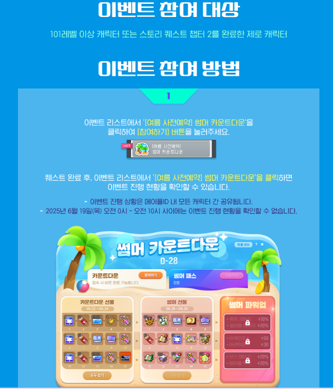 넥슨은 2025년 여름 대규모 업데이트를 앞두고 ‘메이플스토리’에서 썸머 카운트다운 사전 이벤트를 시작했습니다. 해당 이벤트는 5월 22일부터 6월 18일까지 약 한 달간 진행되며, 단순히 게임에 접속만 해도 다양한 보상을 받을 수 있습니다. 출석일수에 따라 ‘카운트다운 선물’과 함께, 5일차, 10일차, 15일차에는 능력치를 증가시켜주는 스킬인 ‘썸머 파워업’도 받을 수 있어, 성장 구간의 유저에게 특히 유용합니다.