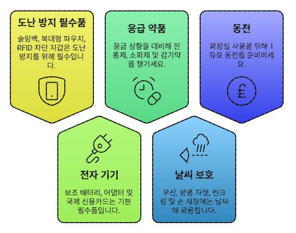 유럽은 소매치기가 많은 지역이 많기 때문에 슬링백, 복대형 파우치, RFID 차단 지갑은 필수입니다. 또한 보조 배터리, 멀티 어댑터(유럽 전압 220V, C/E형 플러그), 국제 신용카드는 기본이고, 비상용 약(진통제, 소화제, 감기약)도 챙기세요. 기후가 급변하는 유럽 특성상 우산, 방풍 자켓, 썬크림, 손 세정제도 매우 유용합니다. 특히 프랑스나 이탈리아에서는 화장실 사용 시 동전을 요구하는 경우가 있으니, 1유로 동전도 항상 준비하세요.