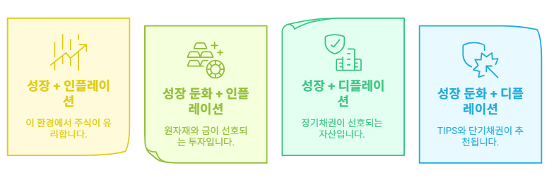 - 성장 둔화 + 디플레이션: TIPS, 단기채권