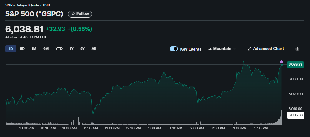 | S&P500 | 6,038.81 | +32.93 | +0.55% | 대형주·IT 섹터 강세 |