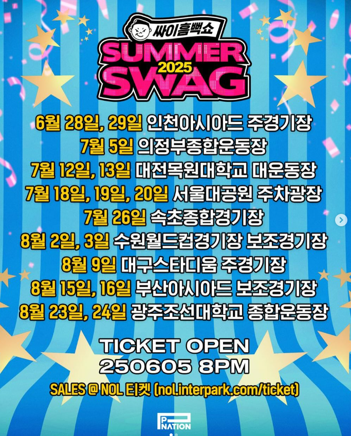 🎶 Pnation 인스타에 2025 싸이흠뻑쇼 예매 일정이 드디어 공개되었습니다. 일정 알람해두세요^^