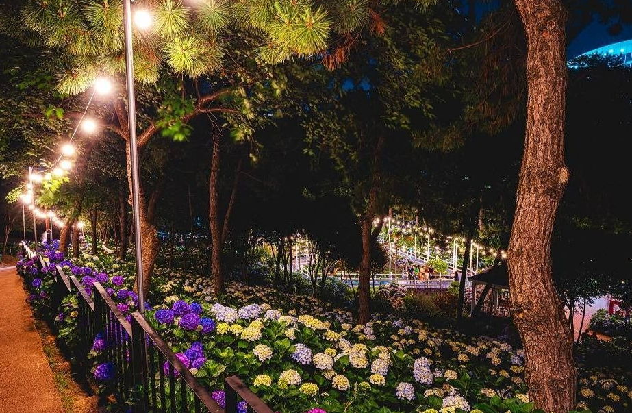 '앤드리스 서머', '쥬디', '베르나' 등 실제 존재하는 인기 수국 품종들이 모여 장관을 이루며, 포토존, 감성 연출 조명, 공연과 함께 여름 감성을 더해줍니다.