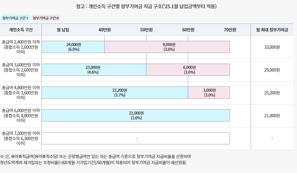 2025년부터는 월 최대 33만 원까지 정부기여금을 받을 수 있어요! 총 납입 한도는 월 70만 원입니다.