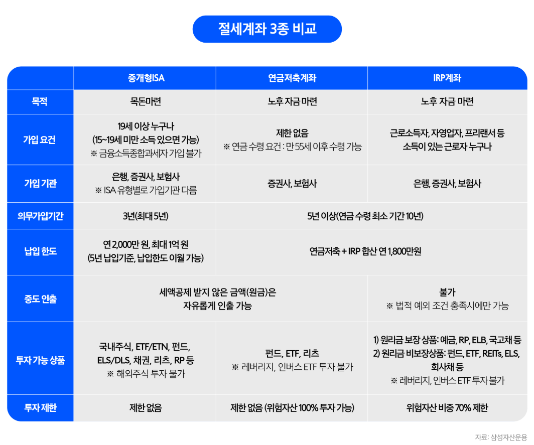 - ISA: 단기~중기 자산 준비에 적합. ETF·예적금 등 비과세 혜택 제공