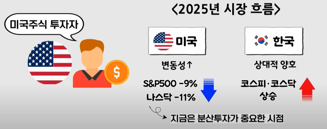 많은 투자자들이 미국 시장을 선호하지만, 2025년 시장 흐름을 보면 한국 시장의 매력을 간과할 수 없습니다. 미국 시장의 변동성이 커진 반면, 한국 시장은 상대적으로 양호한 흐름을 보여주고 있습니다. 분산 투자가 필요한 시점, 한국 시장 비중을 높이는 전략이 유효합니다.